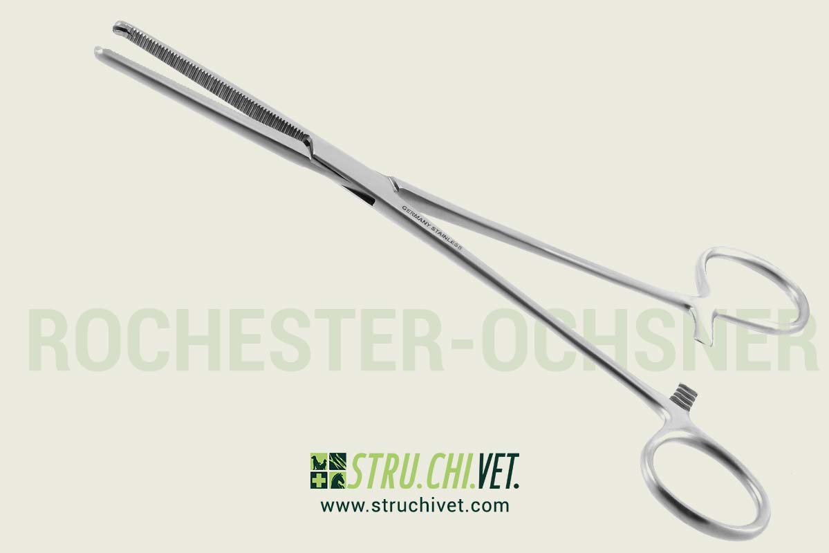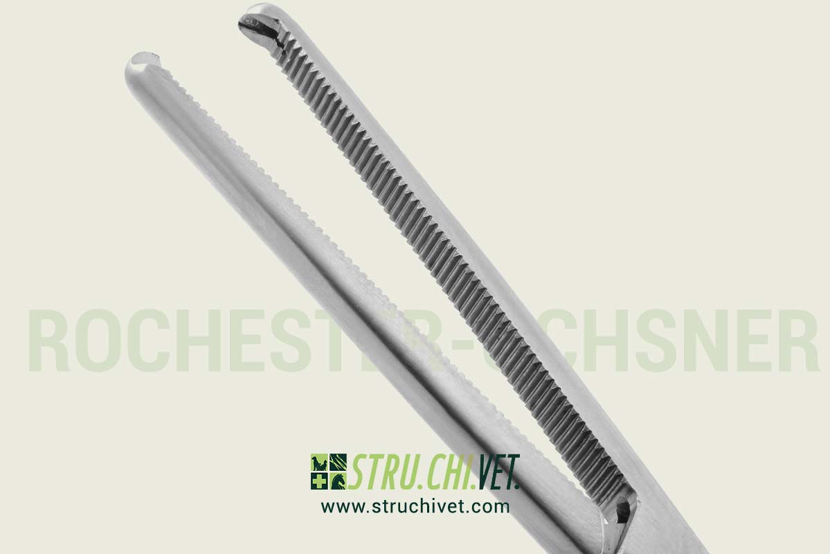 - Le pinze Rochester-Ochsner sono pinze emostatiche che aiutano a bloccare i vasi sanguigni per evitare emorragie durante procedure come la chirurgia ortopedica. Per bloccare i vasi o afferrare i tessuti, queste pinze presentano una punta dentata con due denti. Questo “dente di ratto” può essere descritto come una punta su un’estremità della ganascia che si inserisce tra due denti all’estremità dell’altra ganascia. Questi denti possono essere utili per afferrare tessuti densi. Sono disponibili diverse lunghezze di queste pinze con manico ad anello per facilitare numerose operazioni.